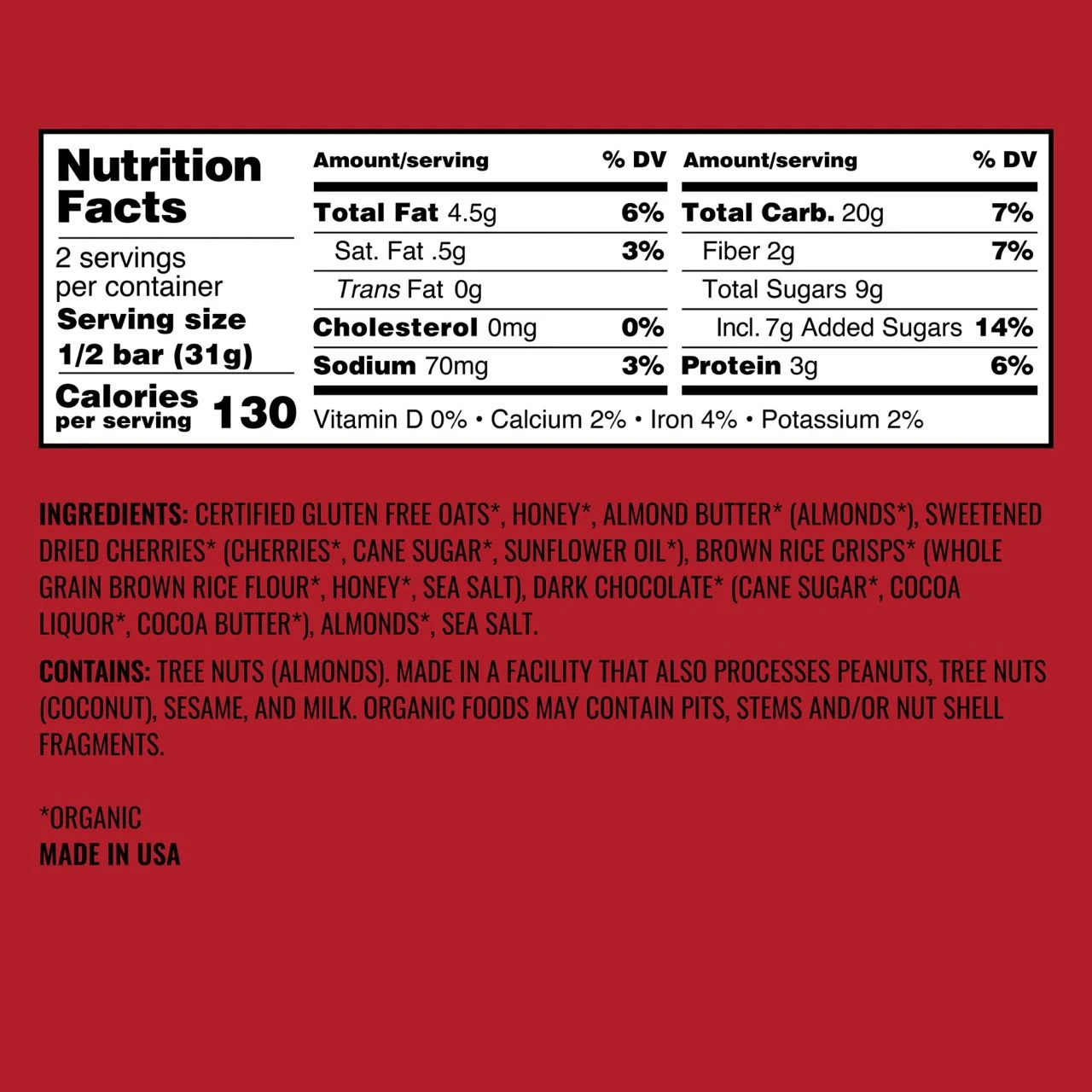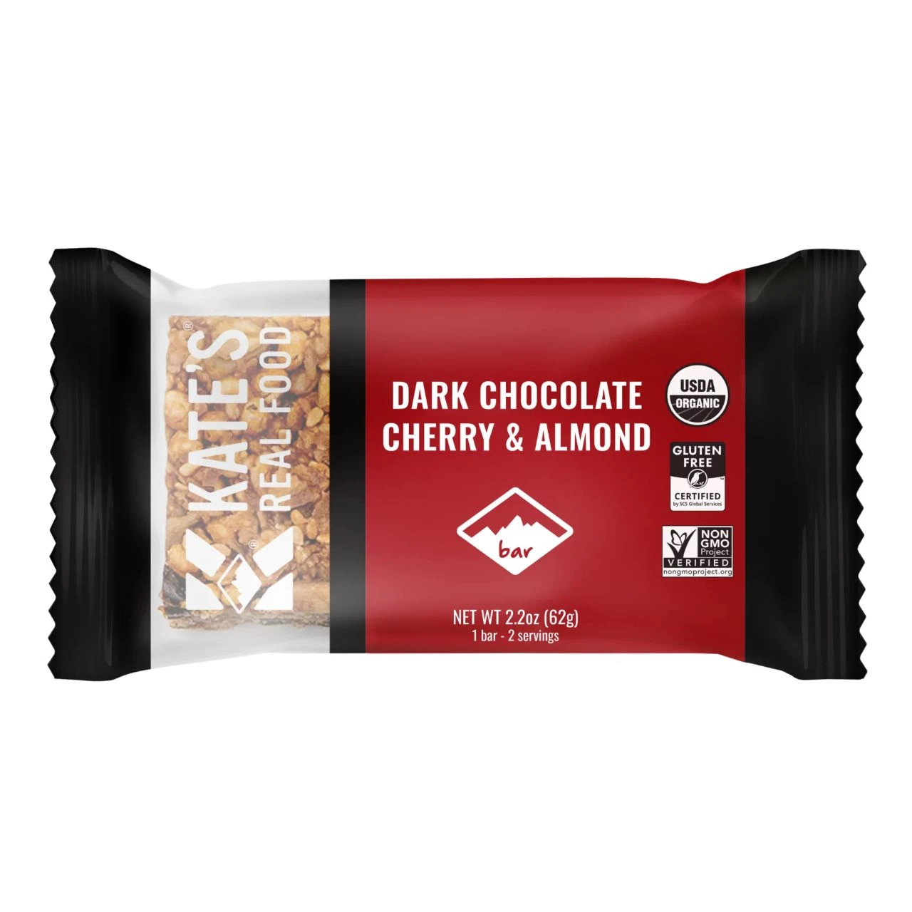 These Dark Chocolate Cherry & Almond Bars pack in 3 grams of protein per serving to help fuel your outdoor adventures or busy day. All of Kate’s Real Food products are made with certified gluten-free oats, making them a good choice for those with gluten allergies or intolerances.