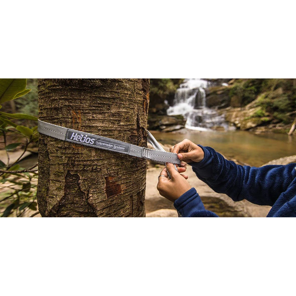 Helios, Titan god of the sun, was light, strong and powerful – just like the Helios Suspension System. Crafted from super-strong Dyneema® line with a polyester blend tree sling, the Helios sets up in a flash and provides superior adjustment with a bury splice. Measuring just over 8 feet and able to accommodate even the most awkward of spacing, this techy, tree-friendly strap breaks legendary boundaries for hammockers.