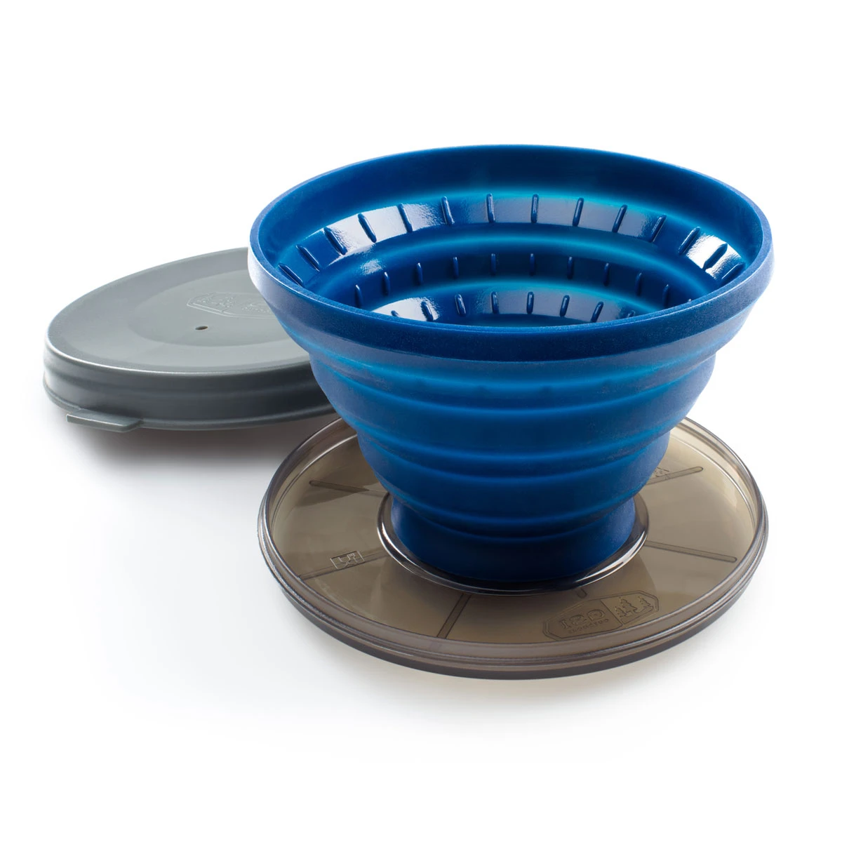 GSI’s Collapsible Java Drip makes it easy to brew up to 12 cups of coffee in the great outdoors. Its collapsible drip cone holds a #4 filter, and the sturdy, silicone bellows design collapses to become a 1″ high, 5.6″ diameter disc. Unique flanged design helps center drip cone over mugs, cups and wide-mouth bottles for stable, spill-free brewing. Lid doubles as a trivet after brewing. Assorted colors.