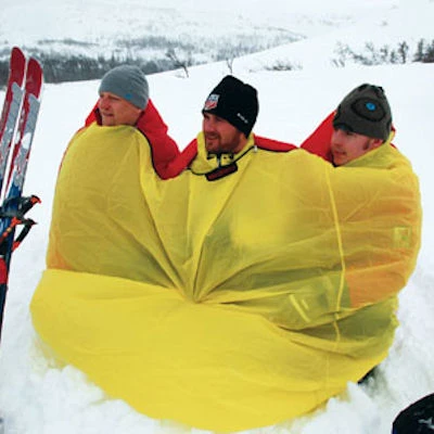 This traditional piece of equipment is given a place in most everyone’s backpack in Scandinavia when walking, skiing or climbing in the mountains. It provides superb protection against wind, snow, and other poor conditions. The Windsack 3 is windproof and water repellent. It has an extended range of applications: protection from the elements on a break, emergency bivouac in a sudden snow storm, a sleeping bag cover in a snow cave, or as a shelter from the wind when you are working on your tan! It is excellent protection against hypothermia when you have to sit out a storm in the mountains. And it is so light that you do not have to do without it on any kind of trip. Three people with smaller backpacks or two people with larger ones have room in the Windsack 3. The Windsack is both roomy and light. At the top there is a zipper with four runners allowing you to stick out your head or to vent out air, and the bottom has a draw cord to cinch around the feet. The top corners have pockets for ski tips.