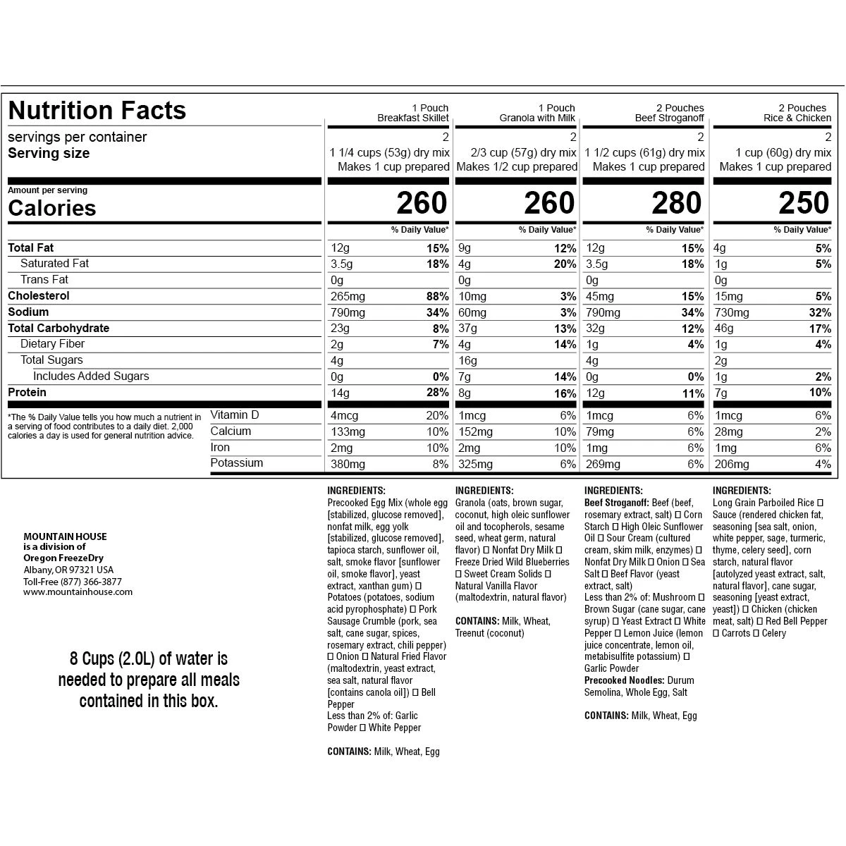 The Mountain House Just In Case 2-Day Emergency Food Supply includes 6 pouches total of Mountain House’s favorite just-add-water meals: