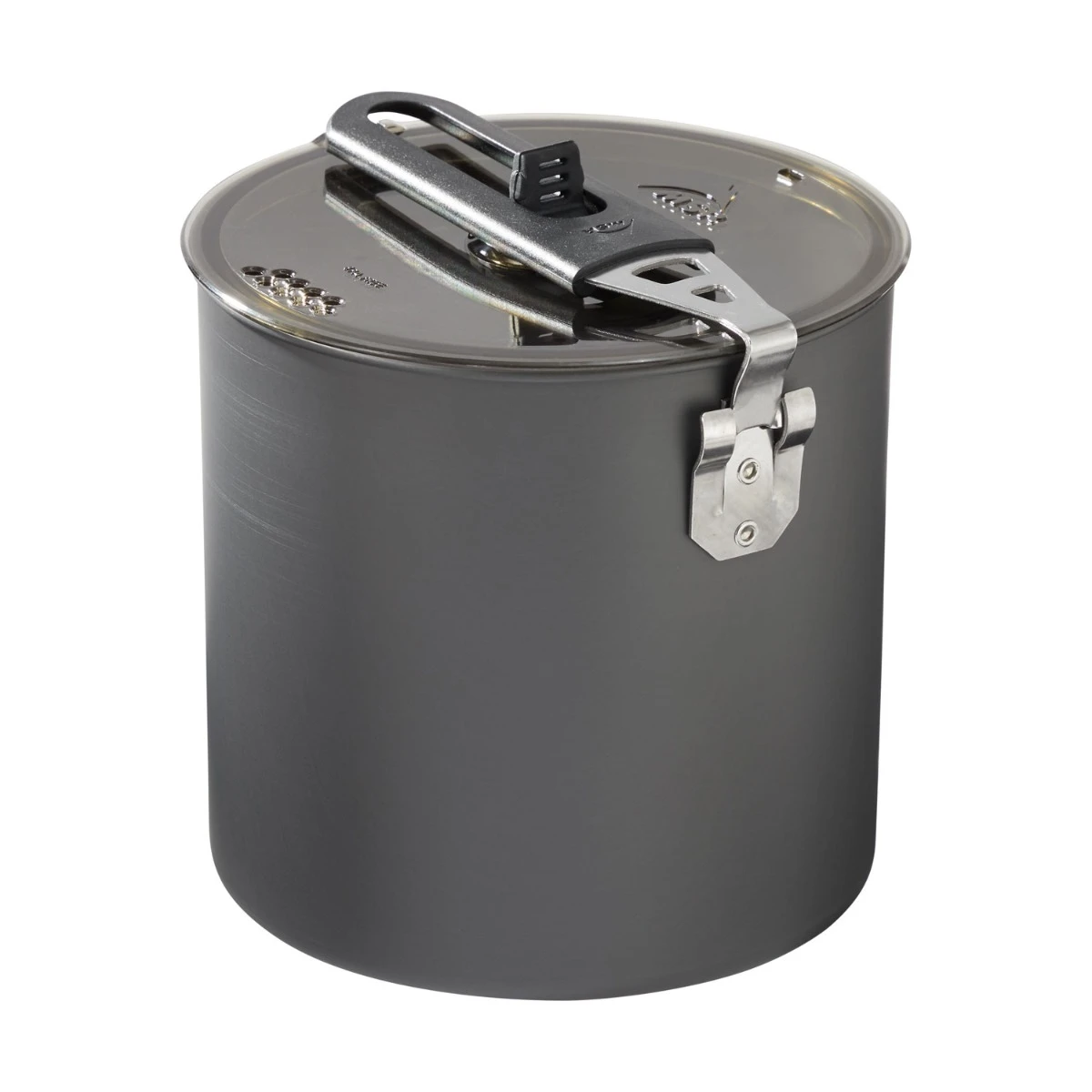 The MSR Trail Lite 2 Liter Pot delivers the lightweight performance of aluminum with the strength of a hard-anodized finish, making it the foundation of a cook kit that will last. With capacity for 2 backpackers, the taller design helps save space in smaller packs. An excellent water-boiler for simple backcountry meals, this pot features room for mugs and utensils or a small stove, and a folding/locking handle to keep it all in place.